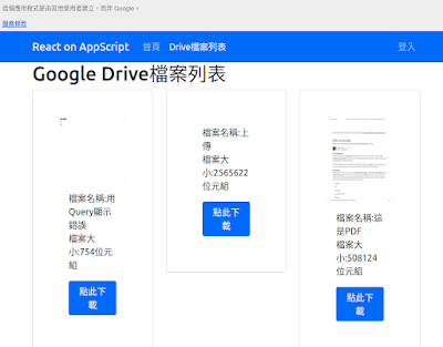Apps Script用Sheet生成動態網頁(22): 移植上傳HTML功能 取得連結 Facebook X Pinterest 以電子郵件傳送 其他應用程式 - 11月 16, 2021 在 第4篇 中我們製作了HTML檔案上傳功能,接著就來移植到React上。 這裡上傳功能一樣使用Google Apps Script的AIP確認當前使用者的E-mail,如果沒有先登入google帳號上傳檔案就會被內部檢核機制阻止。未來這部份會再改成使用會員登入後,就能上傳HTML檔案。拭目以待! 閱讀完整內容